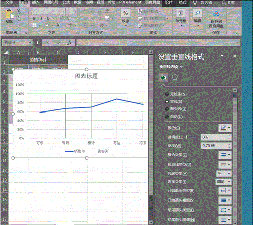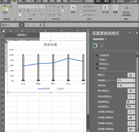 选择达标列直线,点击“设计”菜单-“添加图表元素”按钮-“线条”-“垂直线”,在直线下方添加向下的垂直线;