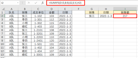 这是sumifs多条件求和,别看它有些复杂,其实意思就是先在B列中选择“张三”,然后在E列中选择2022-1-3,根据所选条件进行D列求和,是不是很简单