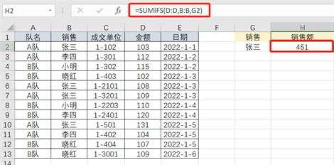 D:D是求和列,B:B是条件区域,G2是求和条件,在此指”张三”。