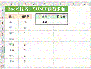 公式:=SUMIF(A4:A11,D4,B4:B11)