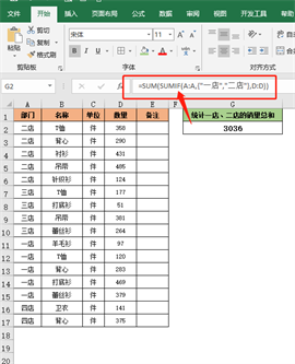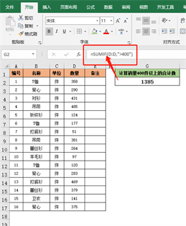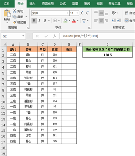 公式:=SUMIF(B:B,”*衫*”,D:D)