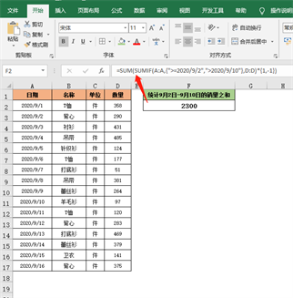 表格中需要统计2020年9月2日至2020年9月10日的销量合计