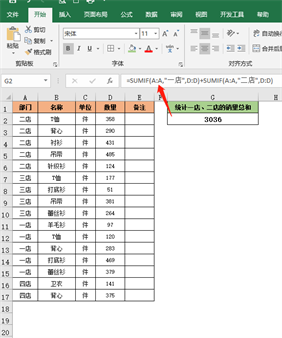 公式1:=SUMIF(A:A,”一店”,D:D) SUMIF(A:A,”二店”,D:D)
