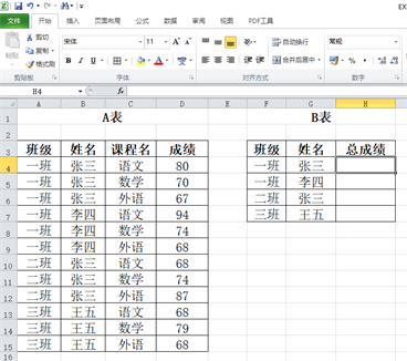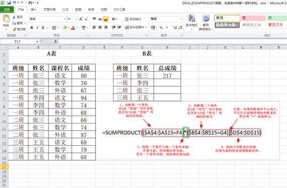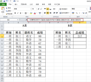 A表是学生成绩明细表,B表是要处理的表,即把学生成绩汇总。注意:一班有张三,二班也有张三,如果单一根据姓名判断,最后汇总结果肯定会出错。可以使用sumproduct函数来实现。