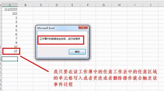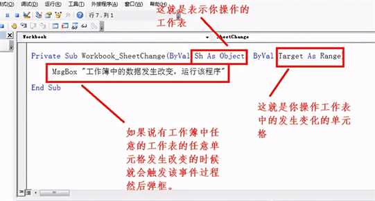 Workbook_sheetchange事件过程的主要功能就是在工作薄中的任意内容发生改变的时候,就会自动运行程序事件。