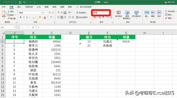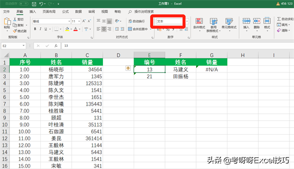 但却出现了错误值,错误的原因在于两个表格中的序号格式不一致。