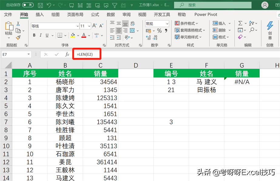 查看E2单元格的字符数,输入公式=LEN(E2),显示字符数为3,表明单元格中存在1个空格或不可见字符。