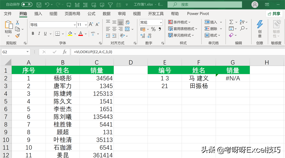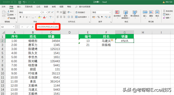 我们用VLOOKUP函数,在左边表格中通过序号和姓名进行销量的精确查找。