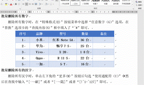 删除所有数字时,在“特殊格式(E)”按钮菜单中选择“任意数字(G)”选项,在“替换”选项卡的“查找内容(N)”框中填入了“^#”即可。