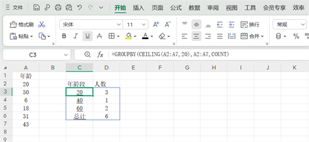 5.人员年龄分组统计:若要将人员按照年龄每隔20岁划分为一个年龄段,可运用=GROUPBY(CEILING(A2:A7,20),A2:A7,COUNT),先把每个人的年龄舍入为20的倍数,以此作为分组的依据,再统计每个年龄段的人数。