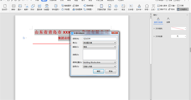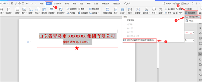 9、以后再次想制作红头文件,只需要【插入】-【文档部件】-【自动图画集】-选择保存的自动图画集名称即可