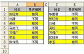 例,如下图所示,要求对比A列和C列的姓名,在B和D列出哪些是相同的,哪些是不同的。