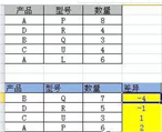 如下图所示,要求核对两表中同一产品同一型号的数量差异,显示在D列。