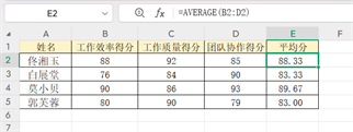 以员工绩效表为例,当要算出每位员工多项得分的平均值时,AVERAGE函数能帮我们快速完成。