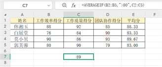 还是用上面的绩效表,若要计算“工作效率得分>80分”的员工的工作质量平均分: