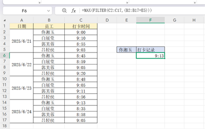 新版本(Excel 365/2021等):直接用“MAX+FILTER”组合。FILTER筛选符合条件的所有记录(如“佟湘玉”的所有打卡时间),MAX从中提取数值最大的记录。
