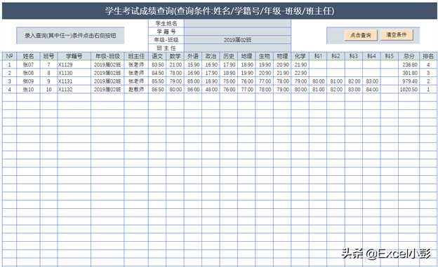 4,查询功能,查询功能就比较强大了,我们可以设计以班主任姓名,年级+班级,学生姓名,学生学籍号等各种条件来进行成绩管理的查询。