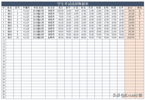 特点1:适用于单一的一次考试,除了适合某个班级使用之外,也适合全年级的成绩管理使用,为了方便成绩的管理,建议一个年级一张成绩表.这样方便使用rank函数进行排名。