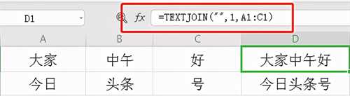 函数公式:=TEXTJOIN(“”,1,A1:C1)