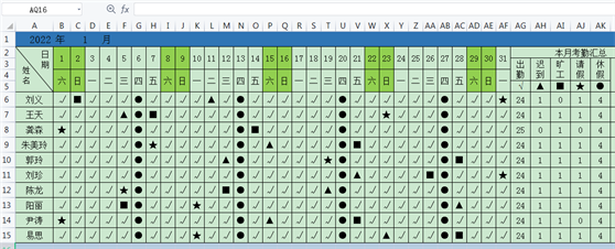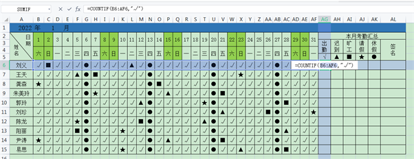 迟到【=COUNTIF(C6:AG6,”▲”)】