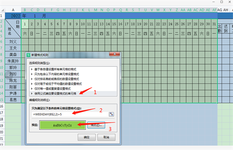 选中考勤表–条件格式–新建规则–按照下图顺序操作即可