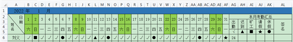 休假【=COUNTIF(F6:AJ6,”●”)】