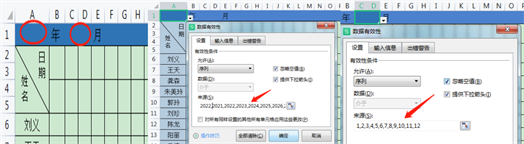 此处点击A1单元格–数据–有效性–允许–序列–来源–(填写年份)
