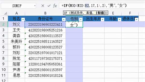 =IF(MOD(MID(B2,17,1),2),”男”,”女”)