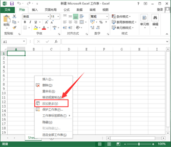 3、双击打开新建的Excel表格,鼠标右键单击工作表左下角的Sheet1,弹出的栏目中点击 添加更多。