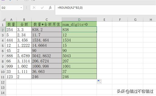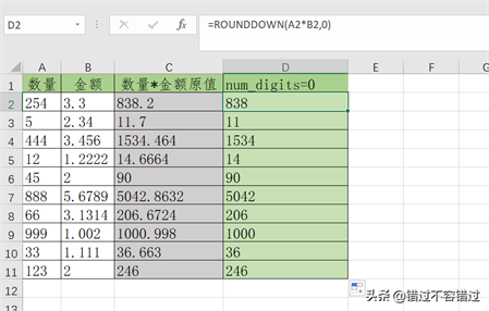 Eg1:公式=ROUNDDOWN(A2*B2,0),小数点右边的小数都舍弃,C列是数量✖金额得出来的数值,D列是用公式得出来的值