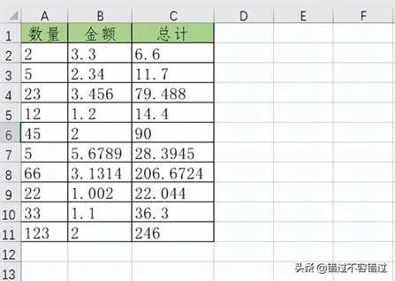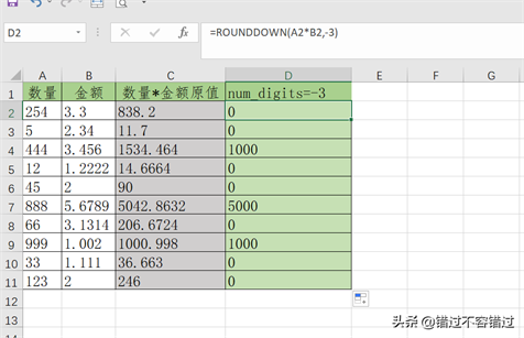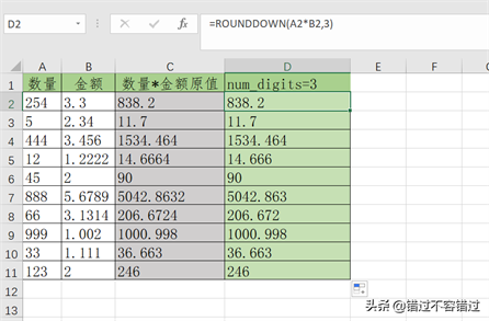 Eg2:公式=ROUNDDOWN(A2*B2,3),小数点右边第三位数后面的小数都舍弃,C列是数量✖金额得出来的数值,D列是用公式得出来的值