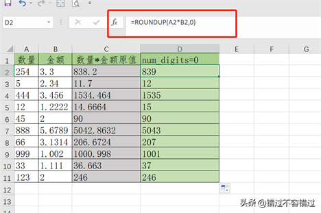 Eg:公式=ROUNDUP(A2*B2,0),小数点右边的小数都舍弃保留下来的最后一位数向上取整
