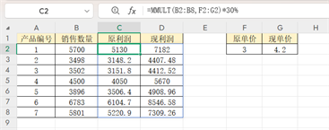 这个公式的逻辑是,先通过MMULT函数算出“单价×数量”的总销售额,然后再乘以利润率,从而得到利润。
