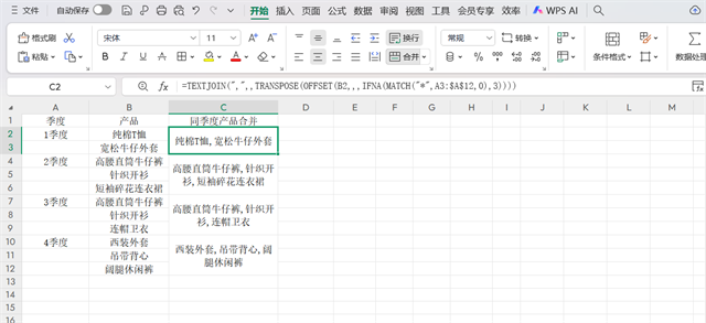 该公式通过匹配非空值确定产品范围,偏移提取后转置合并,利用合并单元格保留首个单元格信息的特性完成数据合并,这种数据合并方式更为直接。