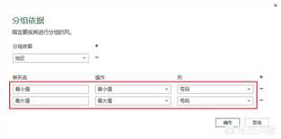 b、点击新列名右侧的加号,添加多个新列。设置新列名分别为【最小值】和【最大值】,操作选择【最小值】和【最大值】,选择需要聚合统计的列为【号码】。如图所示。