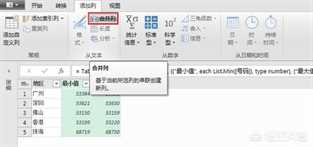 按照上个步骤设置分组依据后,聚合统计的结果如图所示。选择【最小值】和【最大值】两个字段,在功能区菜单切换到【添加列】选项卡,然后点击【合并列】进行两列的合并操作。