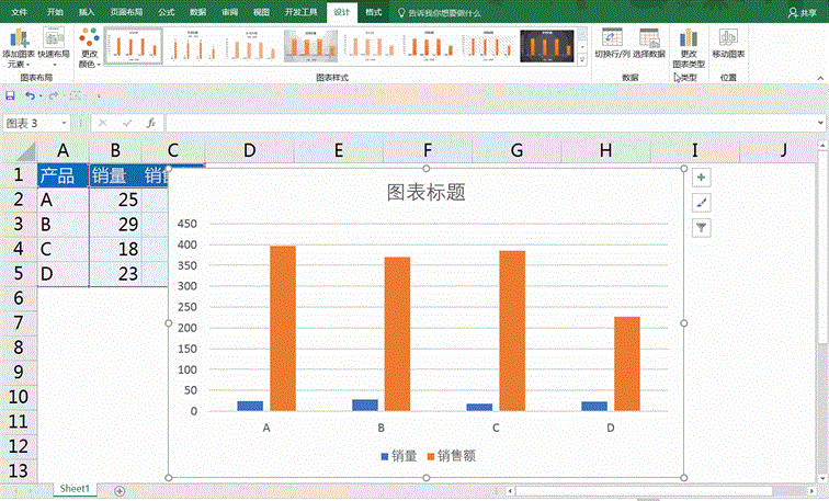 然后选择图表,图表工具-设计选项卡-更改图表类型(或者右键图表选择更改图表类型),选择最下方的组合,销量为柱形图,销售额更改为折线图点击确定即可。那现在就是2种图表的组合了,再根据需求设计下图表的外观,将网格线删掉,显示数据标签等等。