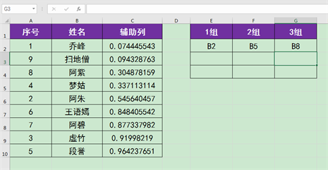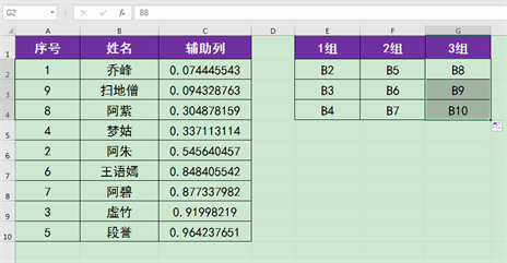 5.接下来我们可以按B列“姓名”列中随机生成的新次序对所有人员进行分组,B2到B4单元格为1组,B5到B7单元格为2组,B8到B10单元格为3组。