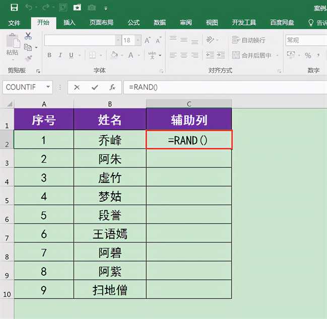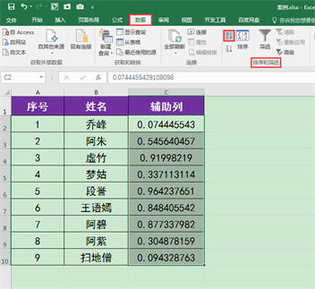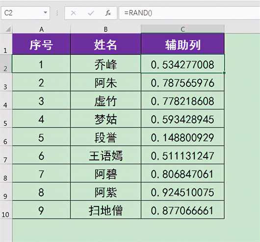 1.在工作表右侧添加一列辅助列,选中C2单元格,输入=RAND(),按回车键确认公式,
