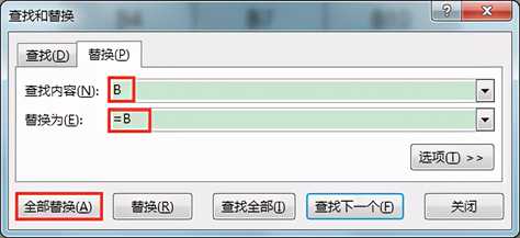 6.选中E2:G4单元格区域,按Ctrl+H组合键调出“查找和替换”对话框,在“查找内容”编辑框中输入“B” ,在“替换为”编辑框中输入“=B” ,单击“全部替换”按钮。在弹出的替换结果提示框中直接单击“确定”按钮。