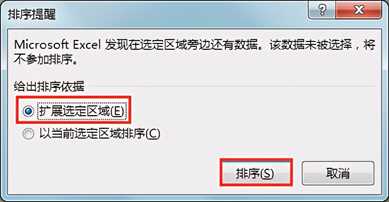 4. 在弹出的“排序提醒”对话框中将“给出排序依据”设置为“扩展选定区域” ,单击“排序”按钮,这样整个表格中的数据就以辅助列中的数值为排序依据重新进行了升序排序。