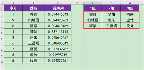 如下图效果所示,使我们今天所要操作的案例,下图工作表中一共有9个人员,我们想随机将这些人员分为3个组别,每个组别3个人。