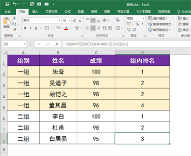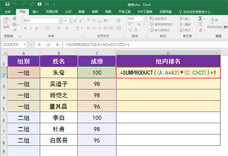 公式说明:(A:A=A2)用于限定A列中单元格的内容为A2,(C:C>C2)用于统计C列中大于C2的单元格的个数,SUMPRODUCT((A:A=A2)*(C:C>C2))用于返回所有“一组”人员成绩中大于C2的有多少个,在此基础上+1就可以返回C2单元格的成绩在所有一组人员成绩中的排名。