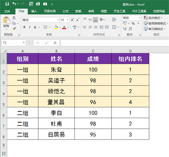 对下图工作表中“一组”人员和“二组”人员分别按成绩进行小组排名,参考效果见D列。如果有新增数据,排名应动态更新。