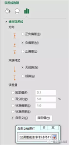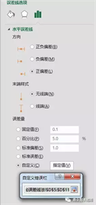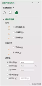 1)选中图表,激活【上下文选项卡】——【设计】——【添加图表元素】——【误差线】——【其它误差线选项】,然后选中误差线,按Ctrl+1或者点击图表右上角十字,调出误差线设置对话框: