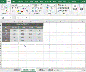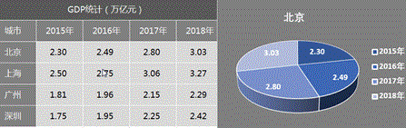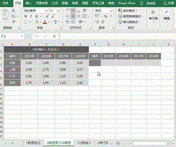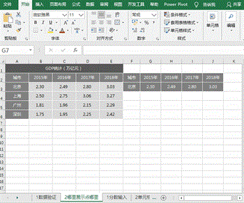 原始数据为2015年-2018年北上广深四大城市的GDP数据,其中数据位于B3:E6单元格中。