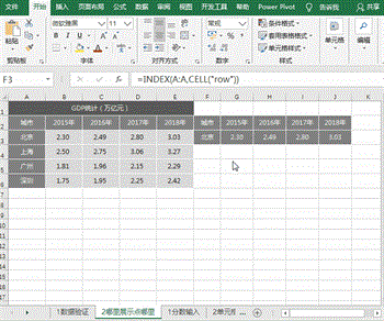 2、函数释义:“=INDEX(A:A,CELL(“row”))”表示:返回单元格的行号CELL(“row”)在A列中对应的内容;依此类推;