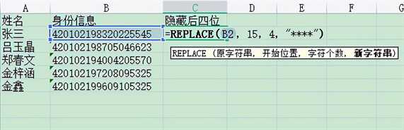 我们选择要隐藏的位数:我们要从第15位开始隐藏,我们隐藏其中的4位,这里面我们要把这4位替换,为什么呢?要注意这个时候要输入英文状态下的两个引号。然后再输入4个英文状态下的一个小的星号(*),替换为星号(*),然后将结果用括号补齐,点击确定可以得到结果。