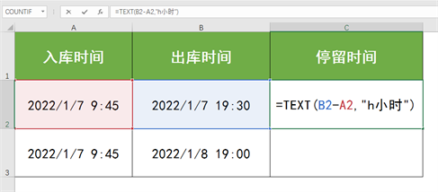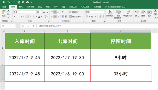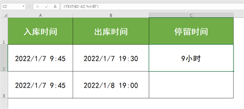 我们将C2单元格中的公式向下填充,发现返回的结果也是“9小时”,这个计算结果是错误的,A3单元格中的入库时间“2022/1/7 9:45”与B3单元格中的出库时间“2022/1/8 19:00”之间的间隔时间明显超过了24小时。