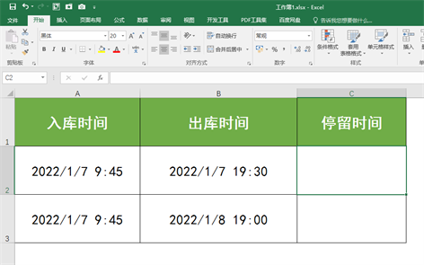 下图工作表A列和B列中分别显示了入库时间和出库时间,接下来我们想在C列中计算两个时间之间的小时差,即停留时间,不足1小时的部分忽略不计。